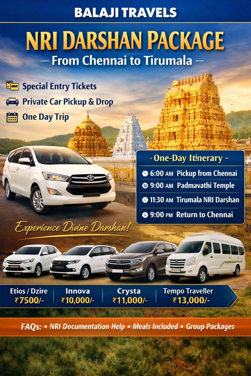 For Non-Resident Indians seeking a smooth and spiritually fulfilling visit to Lord Venkateswara, Balaji Travels presents a well-planned NRI Darshan Package from Chennai with car pickup and drop. This...