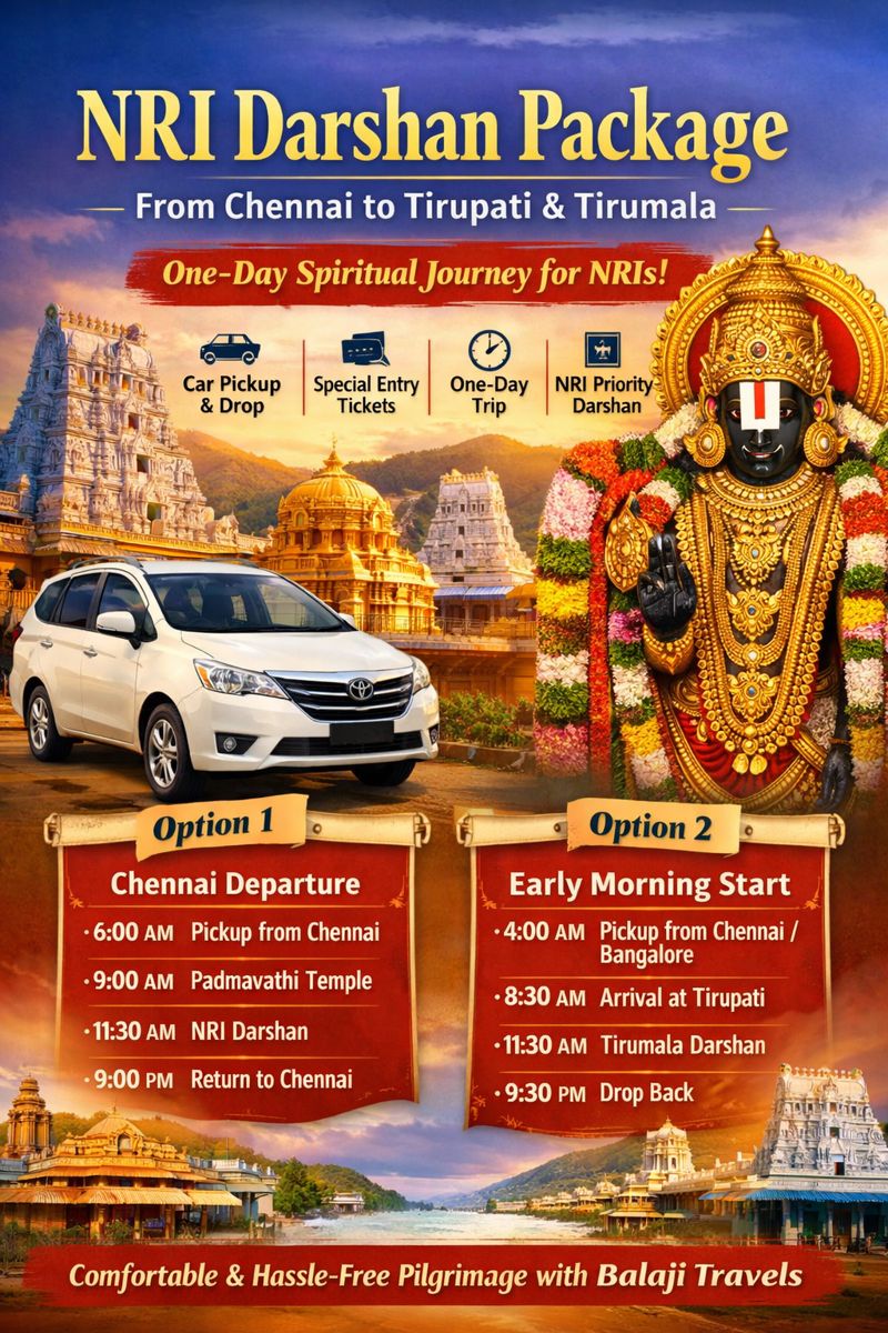 For NRIs planning a spiritual journey to Tirupati, Balaji Travels offers a seamless NRI Darshan Package from Chennai with special entry tickets and comfortable car services. Designed for convenience...