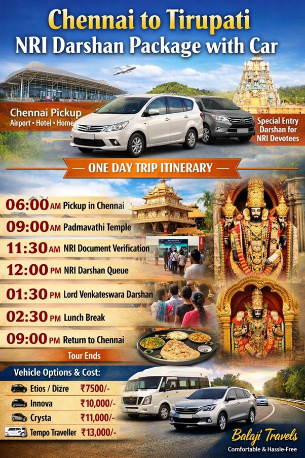 For overseas devotees seeking a smooth and priority darshan at Tirumala, the NRI Darshan Package from Chennai offered by Balaji Travels is designed to deliver a comfortable, time-efficient, and...